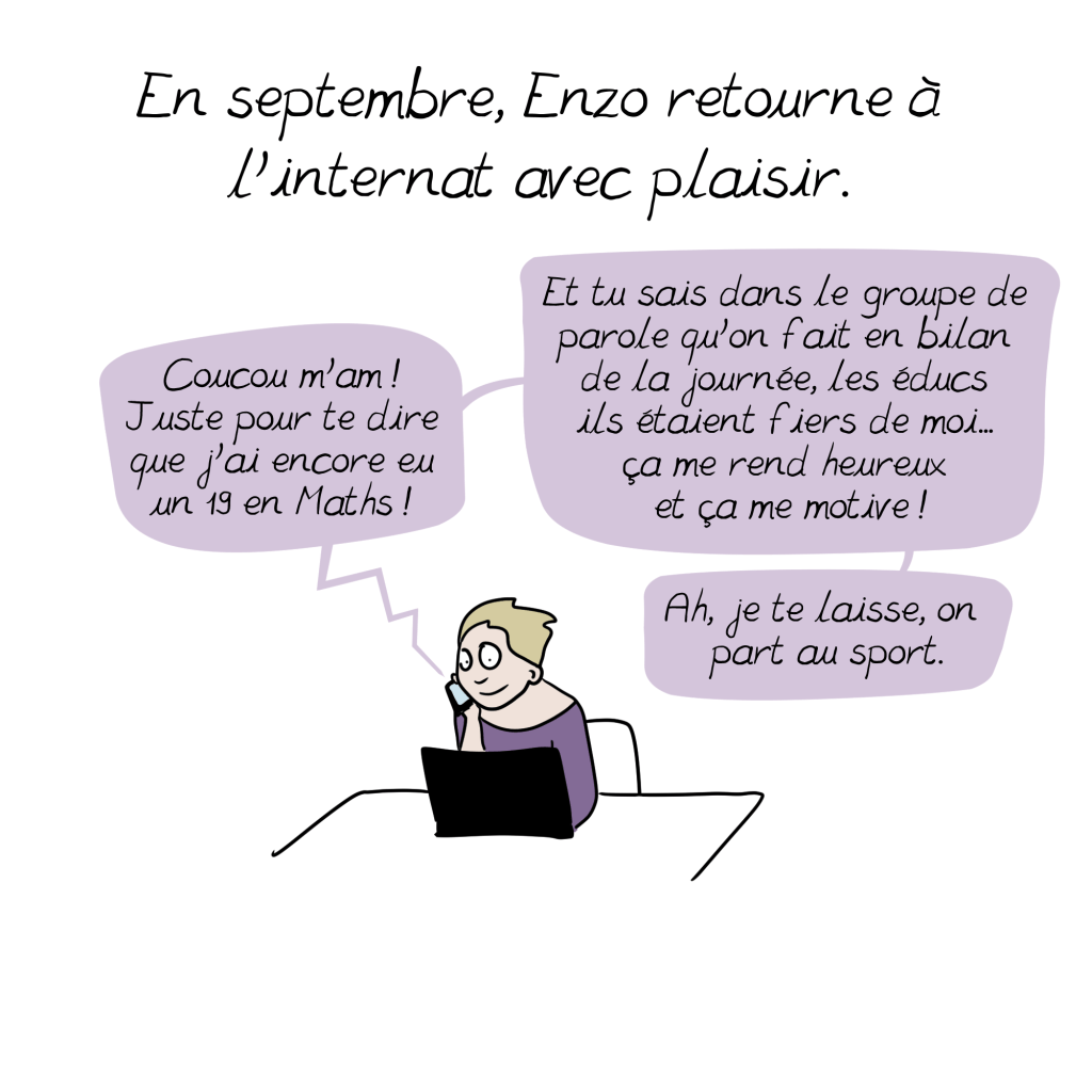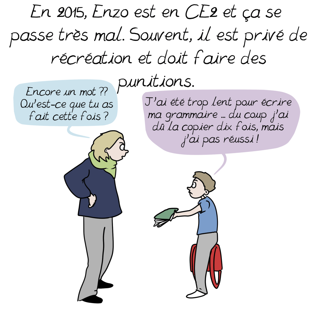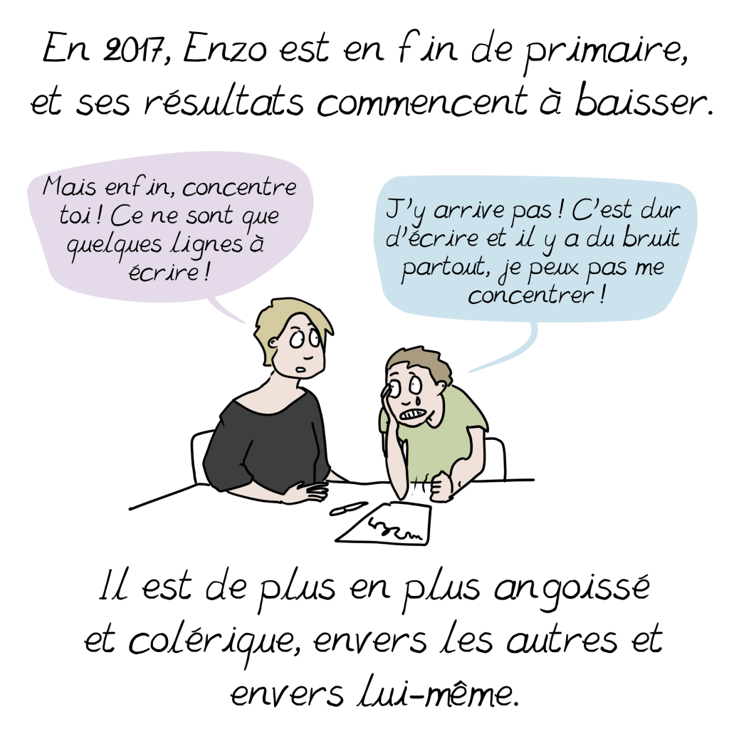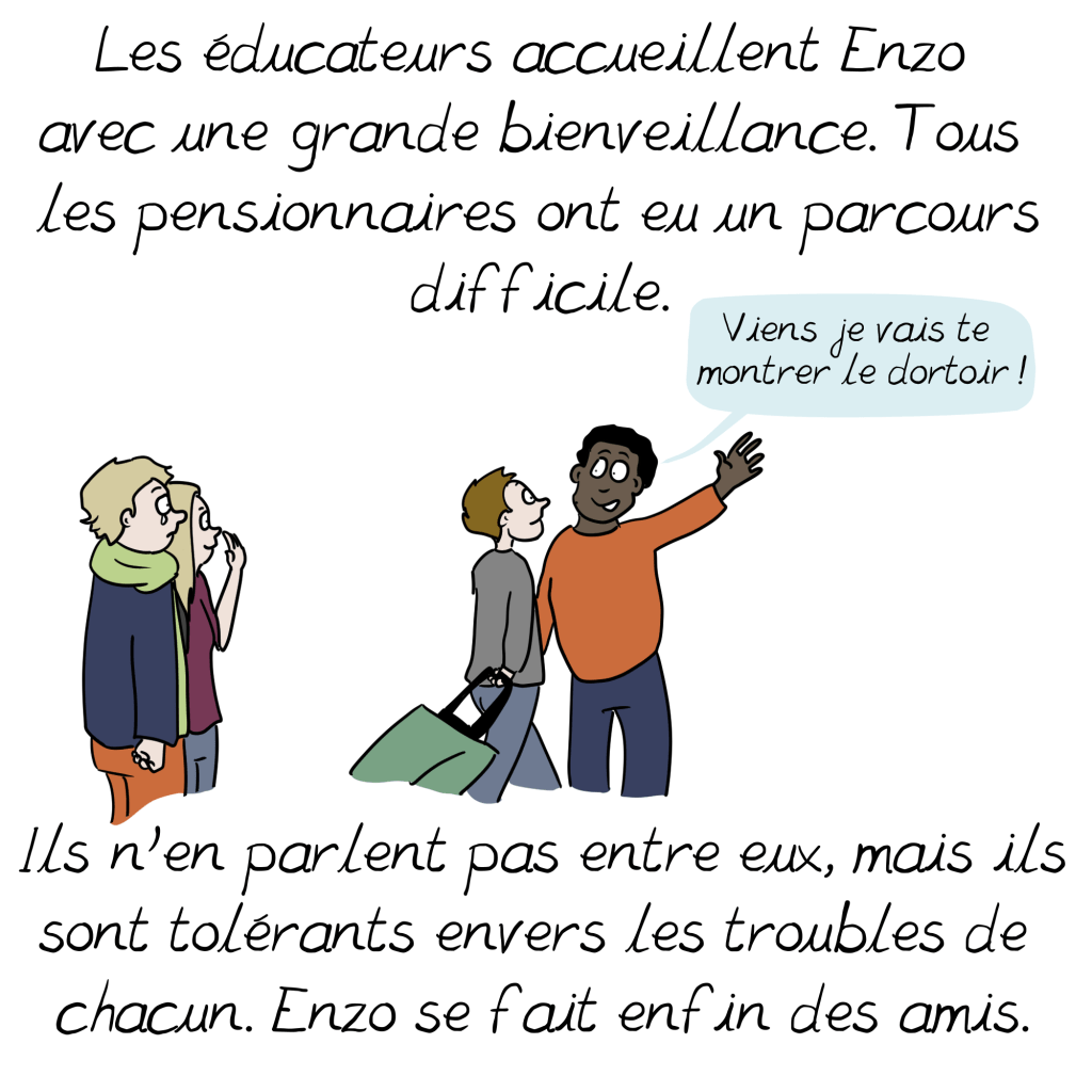 Merci Emma pour cette BD qui raconte presque exactement le parcours de mon Timothée ! Tellement de galères…il a 13 ans et part bientôt en internat colle Enzo! On démarre juste le concerta et j ai bonne espoir que notre vie familiale s améliore sans être obligé de passer par la case explosion familiale !!!