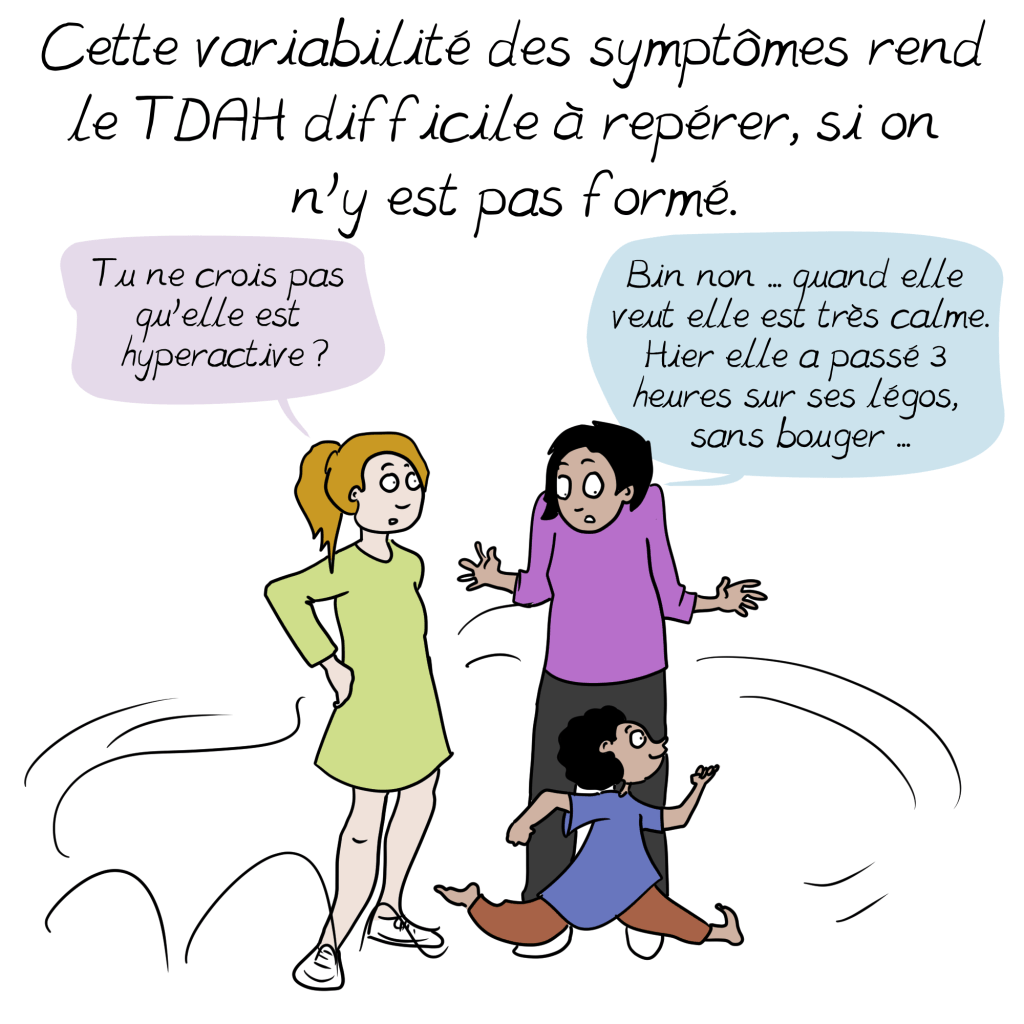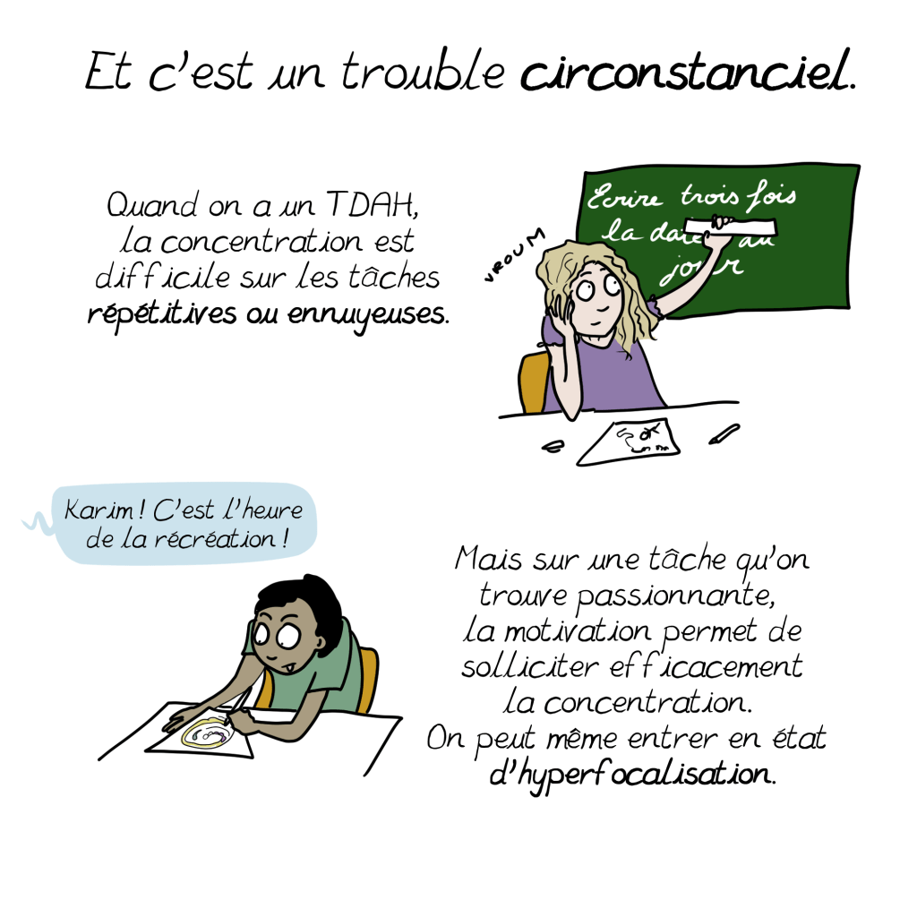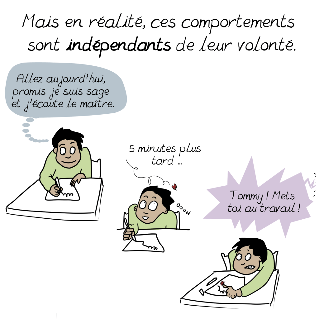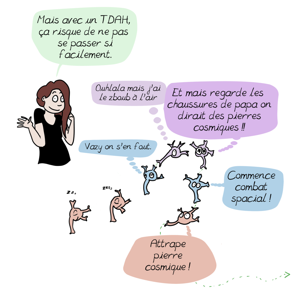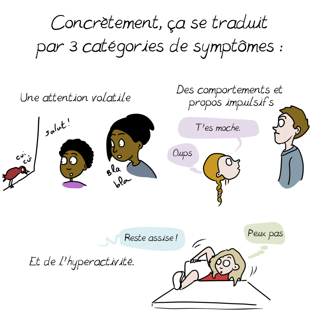 A ce sujet, un petit ajout à la BD issu de mon expérience personnelle : il s’additionne parfois aux symptômes si bien décris ici d’autres troubles, souvent dys (dyspraxie, dyslexie, dysorthographie…) Qui peuvent ralentir le diagnostic en cachant le tdah derrière leurs propres symptômes. Vigilance et suivi sont de mise 😉
