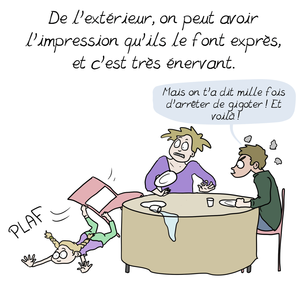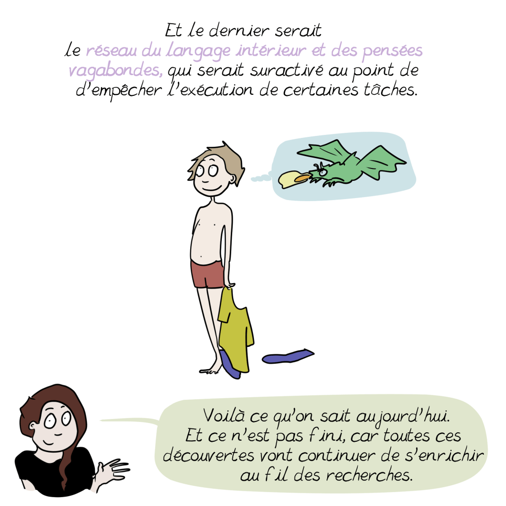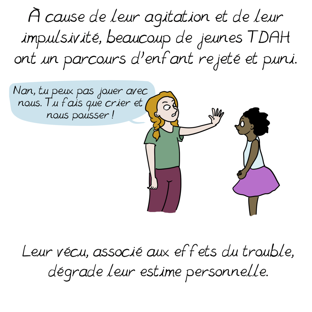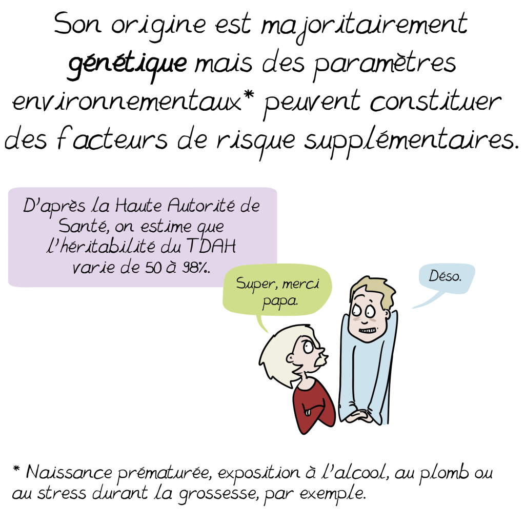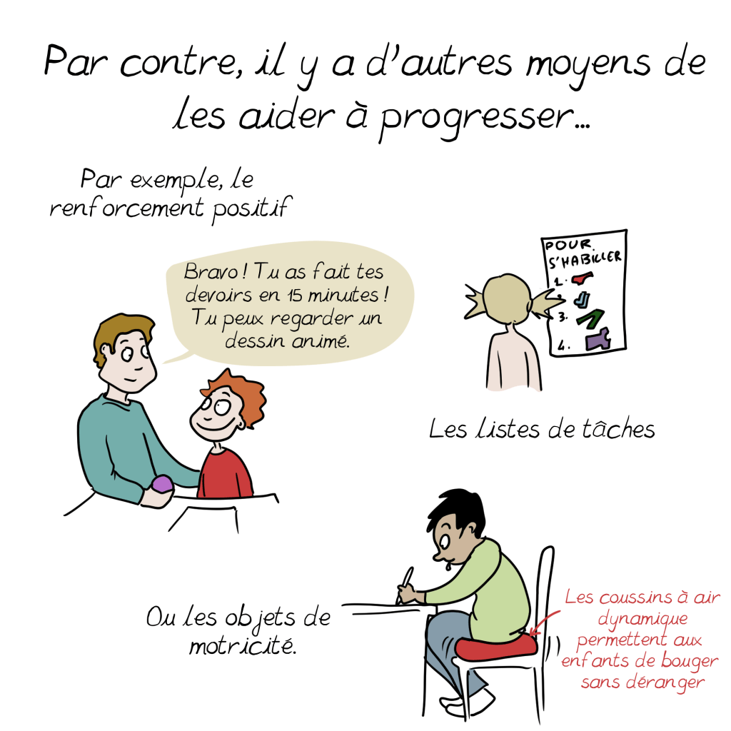 A ce sujet, un petit ajout à la BD issu de mon expérience personnelle : il s’additionne parfois aux symptômes si bien décris ici d’autres troubles, souvent dys (dyspraxie, dyslexie, dysorthographie…) Qui peuvent ralentir le diagnostic en cachant le tdah derrière leurs propres symptômes. Vigilance et suivi sont de mise 😉