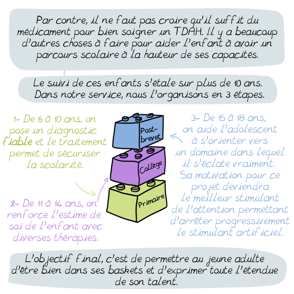 On les aide du mieux qu’on peut, et on voit de belles évolutions, mais malheureusement les moyens ne sont pas à la hauteur des besoins. Le MPH (méthylphénidate) ils l’ont, mais les prises en charge non médicamenteuses nécessaires en complément, bah… Pas assez. On se bat pour améliorer les choses, mais on se heurte à un système à bout de souffle. Dommage car beaucoup de ces jeunes pourraient s’épanouir bien mieux si on arrivait « juste » à suivre ce qui est théoriquement recommandé…