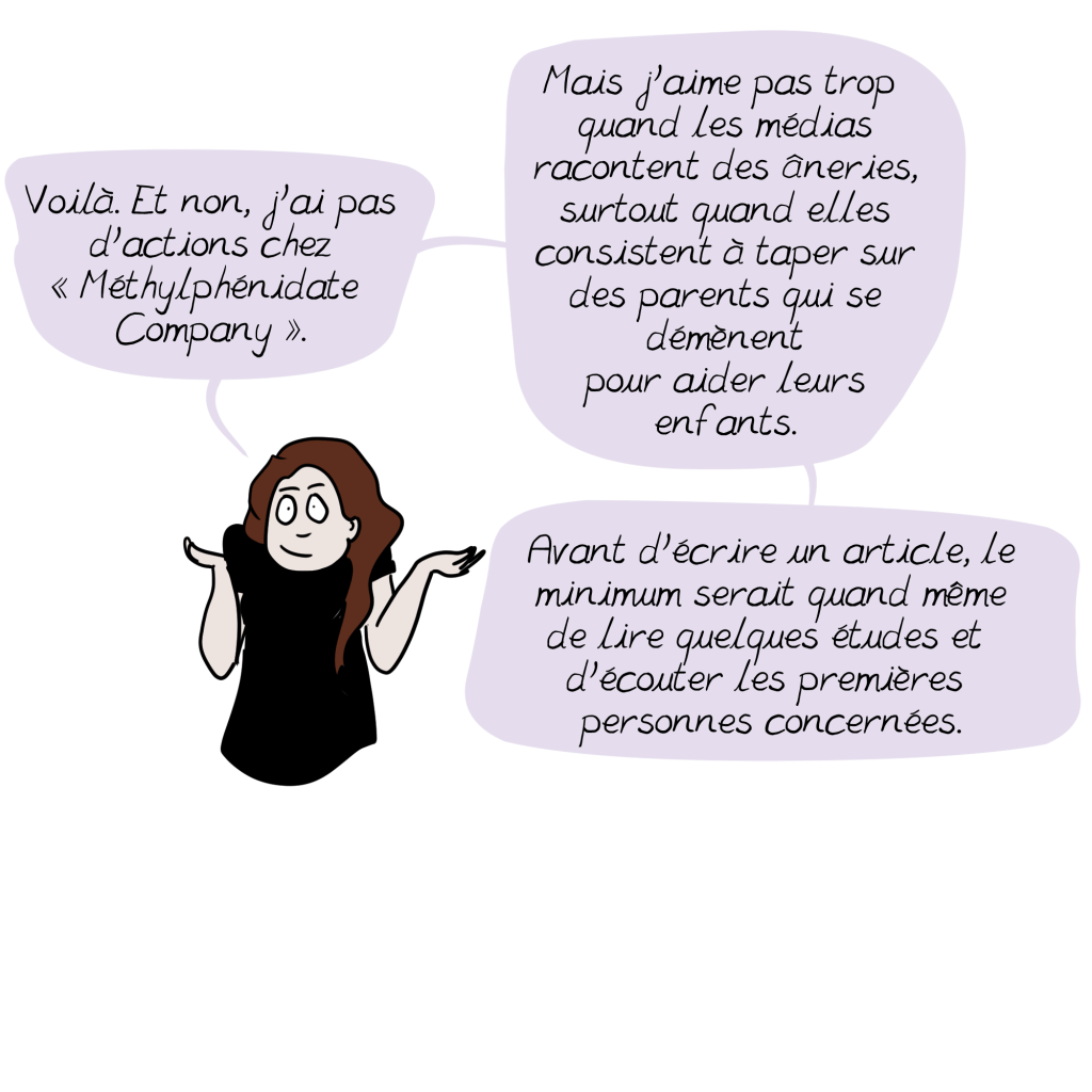 Sur un point je suis d’accord c’est que si l’école était financée correctement par l’état, avec des AESH, des petits groupes etc. la nécessité du traitement se restreindrait sûrement aux enfants avec un TDAH sévère. Il arrive souvent que les parents se tournent vers le traitement après avoir tout essayé, mais pour éviter à leur enfant une exclusion d’une école qui ne sait pas comment les accueillir. C’est un problème.