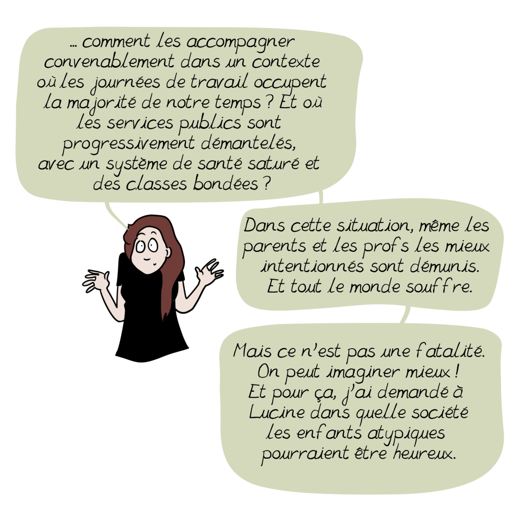 Mon fils pourrait se voir coller les mêmes étiquettes, mais pour l’instant l’instruction en famille l’en préserve. Vous évoquez dans la BD un monde idéal avec une école publique inclusive. Je pense en effet qu’il s’agit d’un service public et que l’Etat devrait avoir l’obligation de proposer un accueil adapté à chacun. Je pense également qu’on devrait avoir le droit de choisir de ne pas entrer dans cette norme et de prendre un chemin qui nous convient mieux et qui correspond davantage à nos aspirations. En ce qui me concerne, l’instruction en famille basée sur les apprentissages autonomes me satisfait pleinement, et mon fils de 5 ans semble s’y épanouir. Ce qui pourrait être un trouble dans la norme de l’école n’en est pas un dans notre mode de vie. Il vit pleinement intégré dans notre petite ville (3000 habitants), va au marché, voit des enfants à l’école de musique, au sport, à la ludothèque, …, discute avec les voisins retraités, voit très souvent ses grands-parents, se passionne pour l’astronomie, les dinosaures, la faune sauvage, …