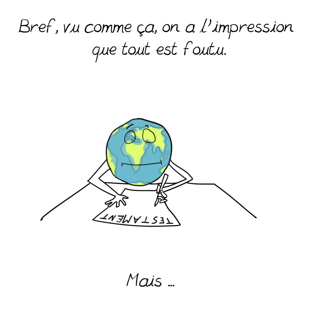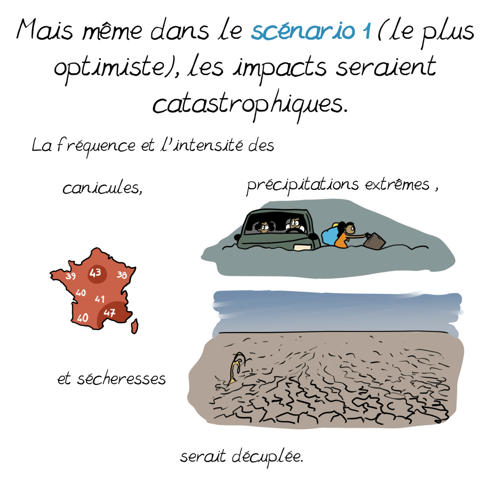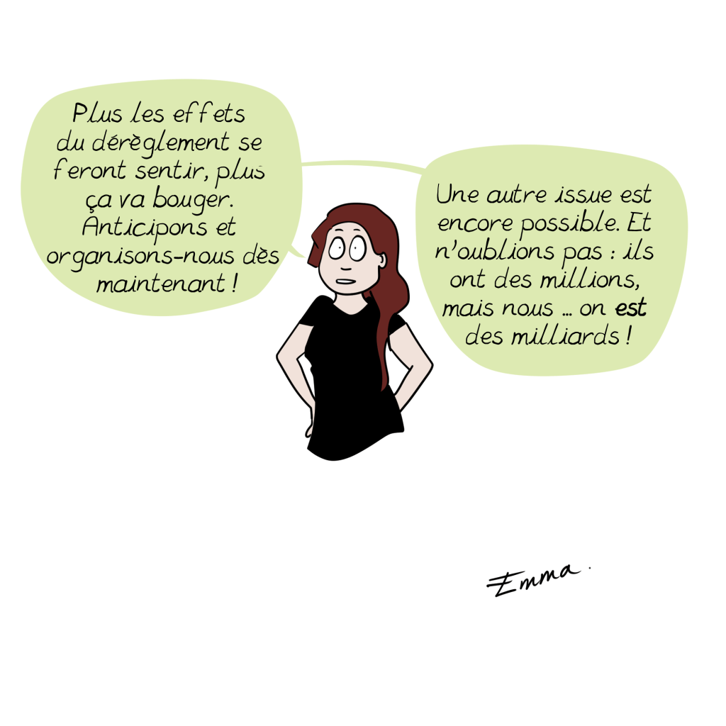 Votre BD devrait être diffusée plus largement (Jancovici a réussi, pourquoi pas vous?) et en particulier aux décideurs qui, bien (trop) souvent pensent connaitre le sujet (car ils en ont entendu quelques bribes dans les médias, ou quelques notes d’attachés parlementaires) mais n’ont aucune connaissance/conscience de la réalité du déroulement des scenarios et des conséquences en chaines.