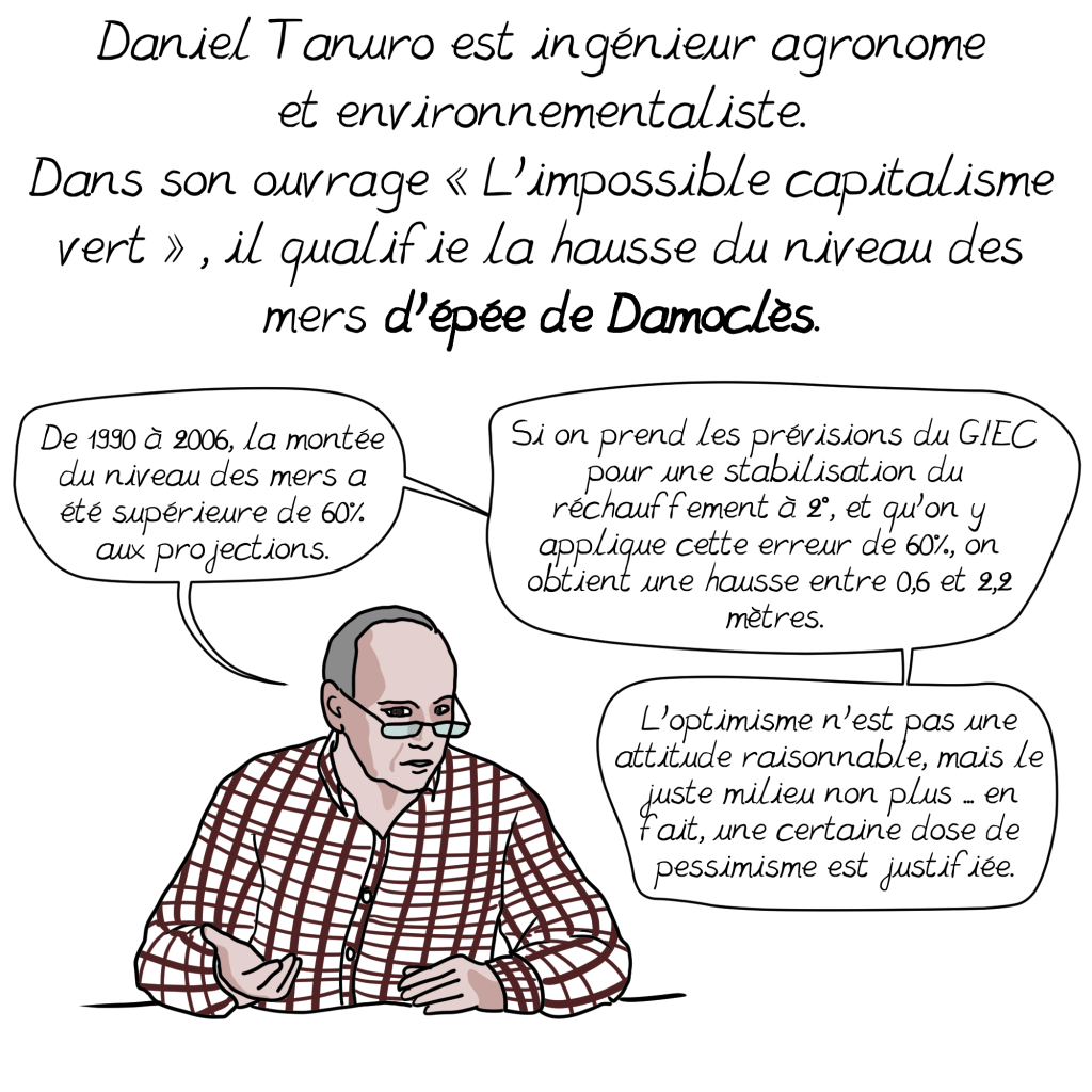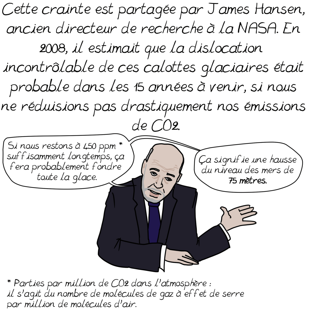 1. Je suis curieux de savoir ce que représente une montée des eaux de 75 mètres en France. Certainement un bouleversement complet de la carte. Toutes les côtes seraient probablement submergées, des centaines de kilomètres carrés de terres arables noyées, des villes entières sous l’eau, des Dom-Tom rayée de la carte. De quoi encourager un changement profond.