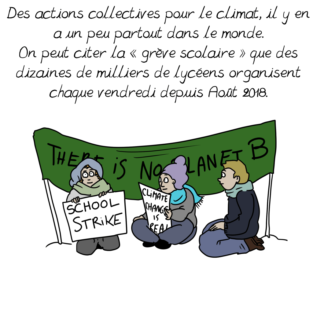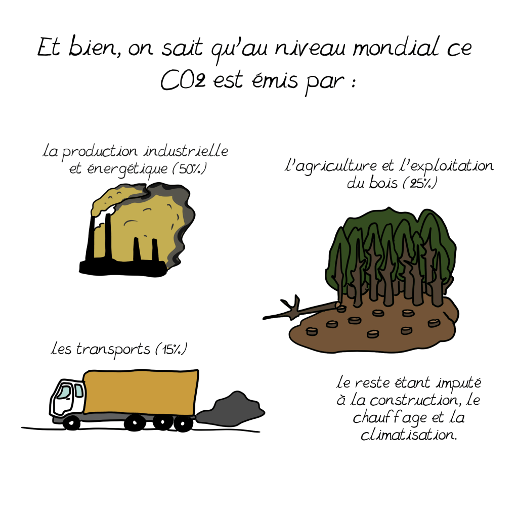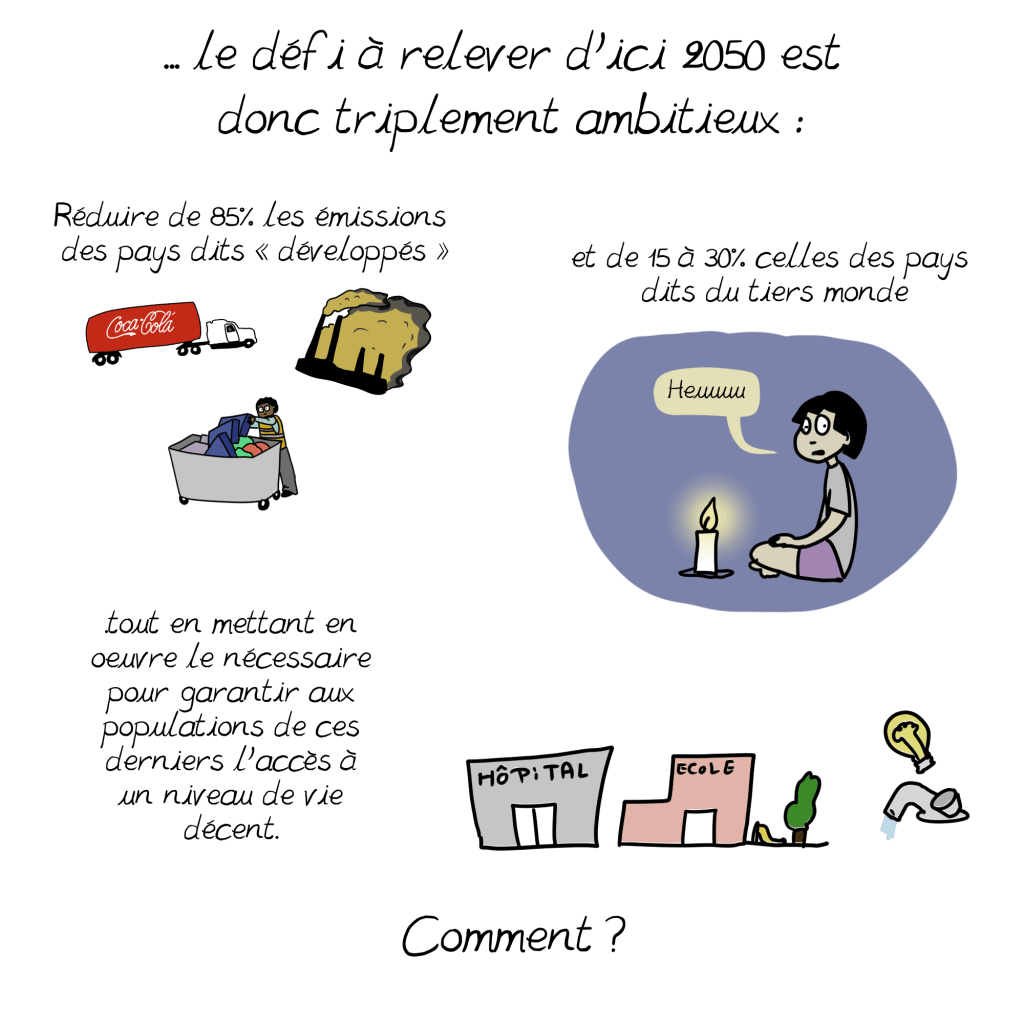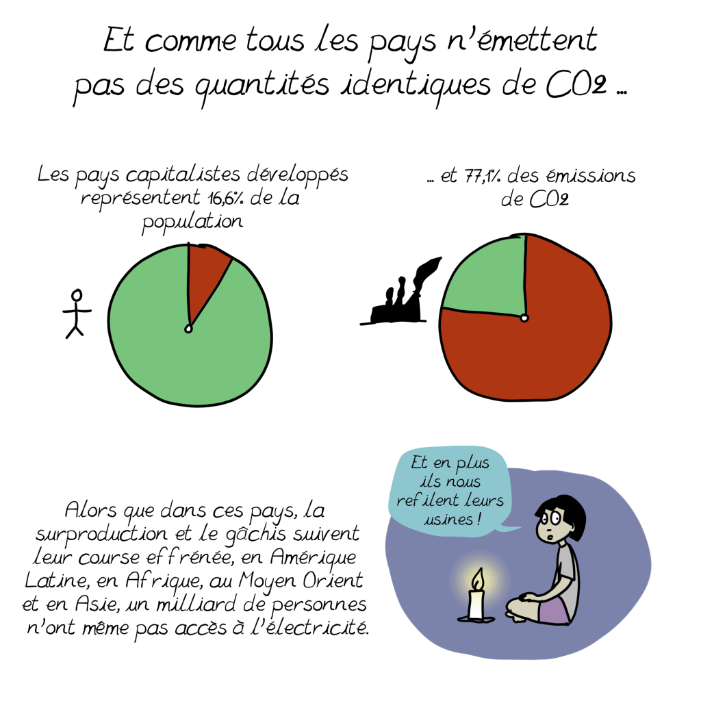 C’est pourquoi j’ai été surprise en lisant que les solutions que vous mentionnez dans cette planche ne renvoient qu’à la contestation politique, alors que le constat est que c’est notre mode de vie actuel, dans les pays « capitalistes développés », qui émet par habitant le plus de C02: comme vous le soulignez d’ailleurs (16,6% de la population pour 77,1% des émissions d’après cette planche). On a beau jeu d’accuser l’Inde ou la Chine par exemple, dont les usines tournent d’ailleurs en bonne part pour satisfaire nos petits désirs d’occidentaux, souvent au détriment des besoins fondamentaux de leurs populations pléthoriques. Nous devons impérativement changer cela, et tout de suite; je crois comprendre que nous sommes d’accord sur ce constat.