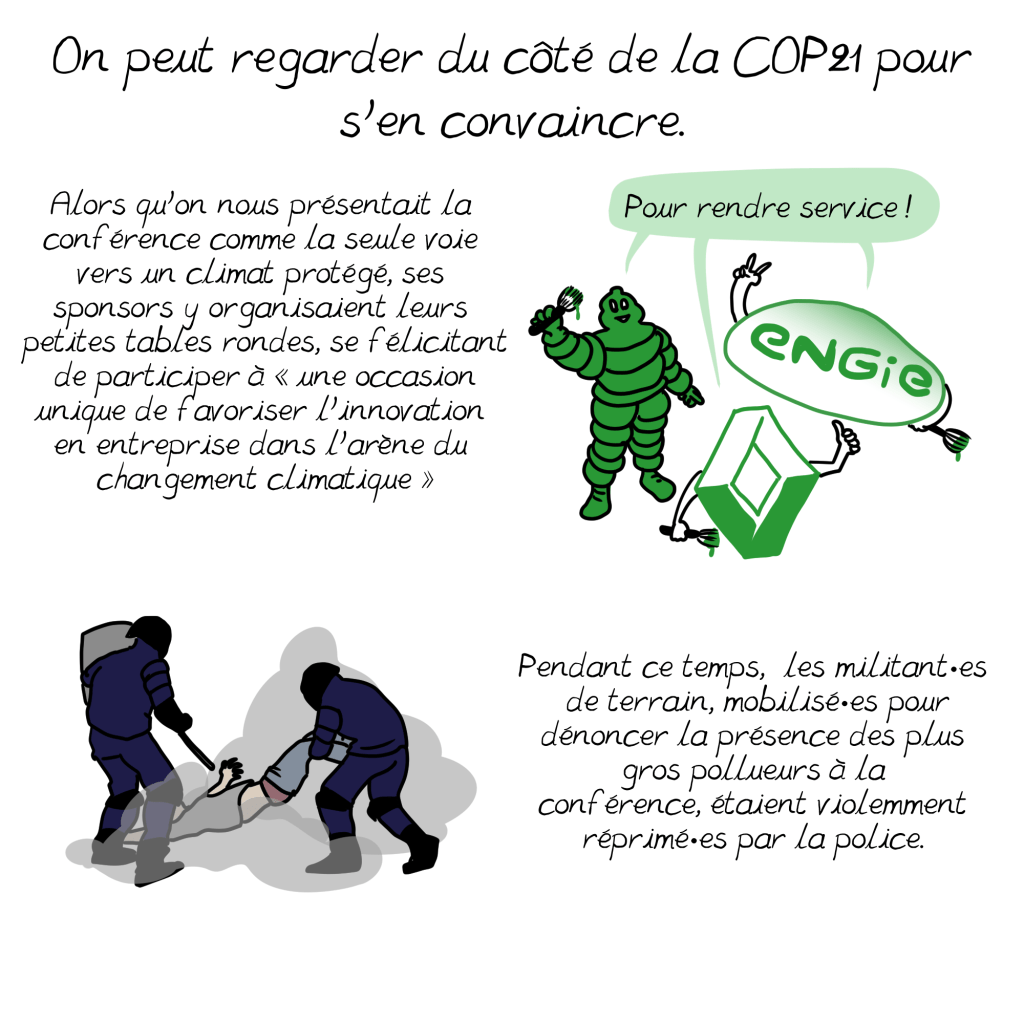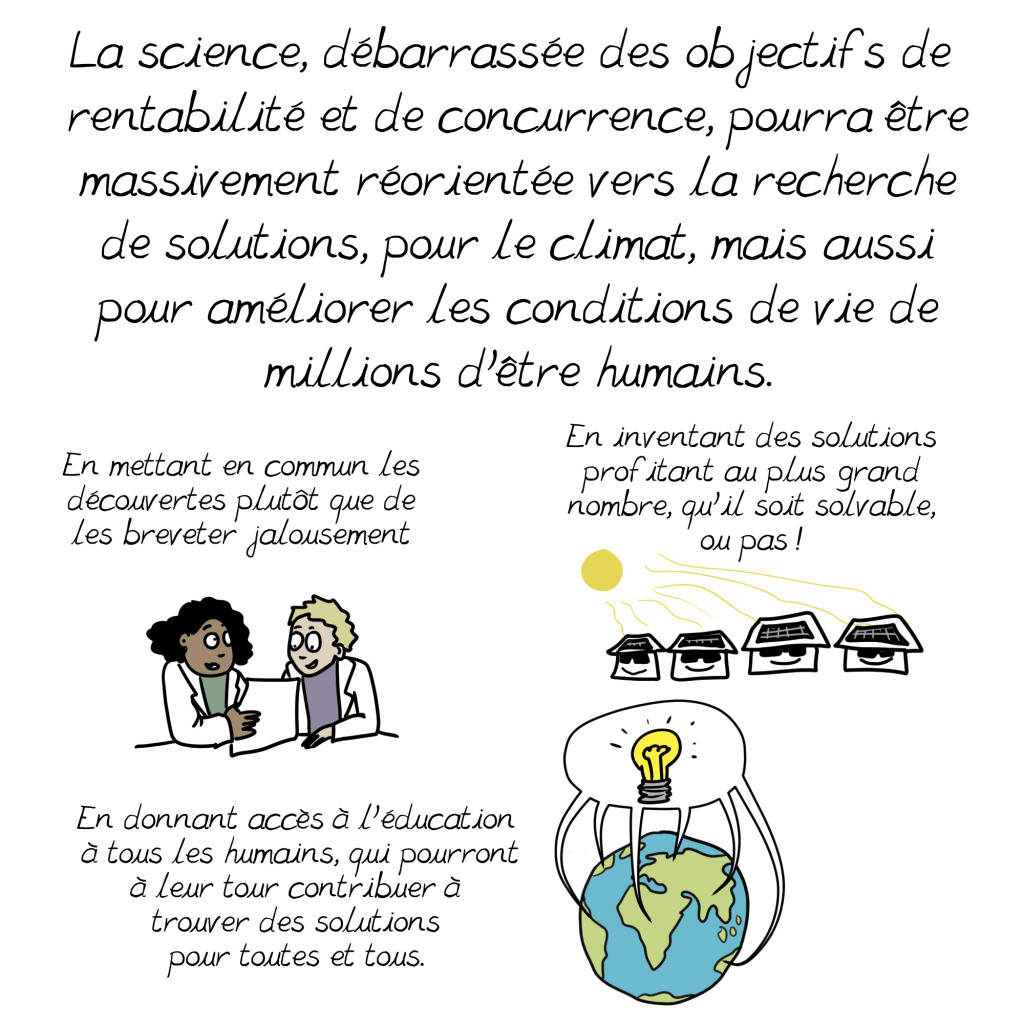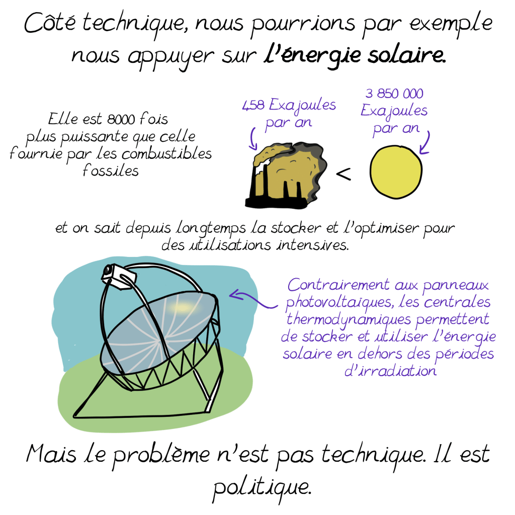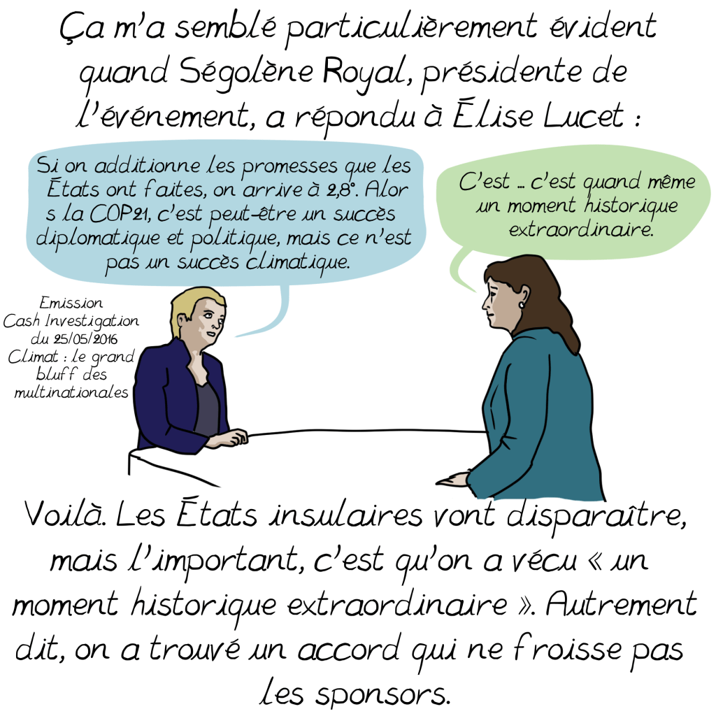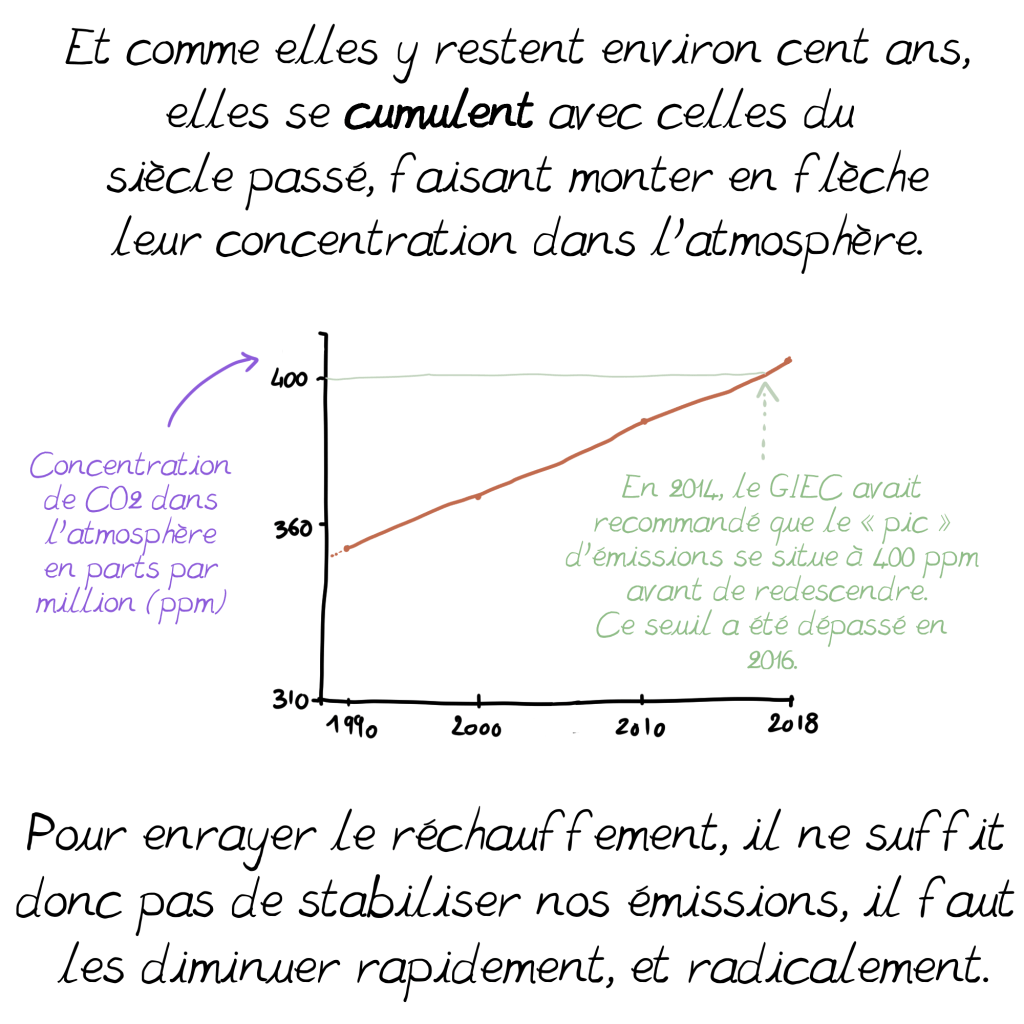 C’est pourquoi j’ai été surprise en lisant que les solutions que vous mentionnez dans cette planche ne renvoient qu’à la contestation politique, alors que le constat est que c’est notre mode de vie actuel, dans les pays « capitalistes développés », qui émet par habitant le plus de C02: comme vous le soulignez d’ailleurs (16,6% de la population pour 77,1% des émissions d’après cette planche). On a beau jeu d’accuser l’Inde ou la Chine par exemple, dont les usines tournent d’ailleurs en bonne part pour satisfaire nos petits désirs d’occidentaux, souvent au détriment des besoins fondamentaux de leurs populations pléthoriques. Nous devons impérativement changer cela, et tout de suite; je crois comprendre que nous sommes d’accord sur ce constat.