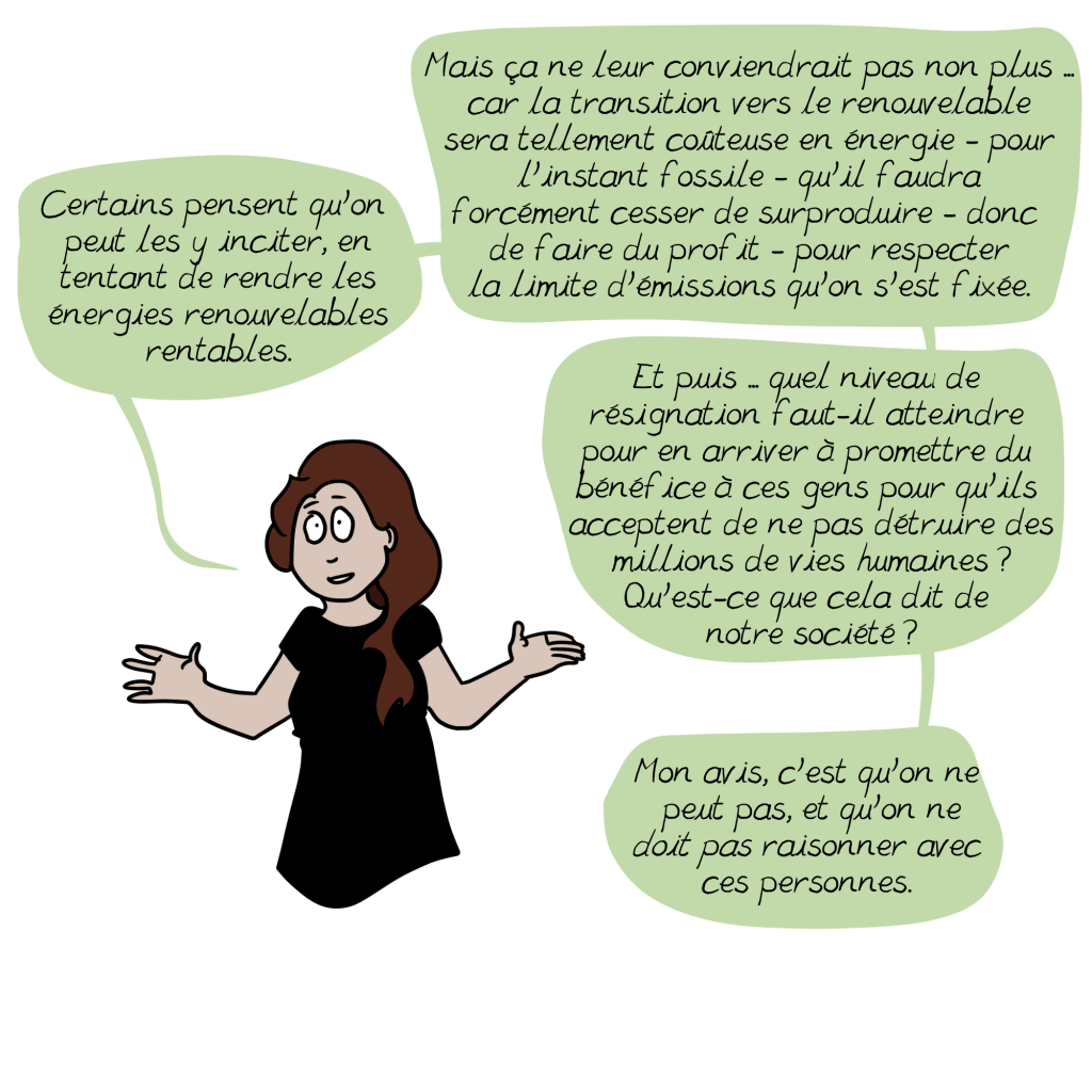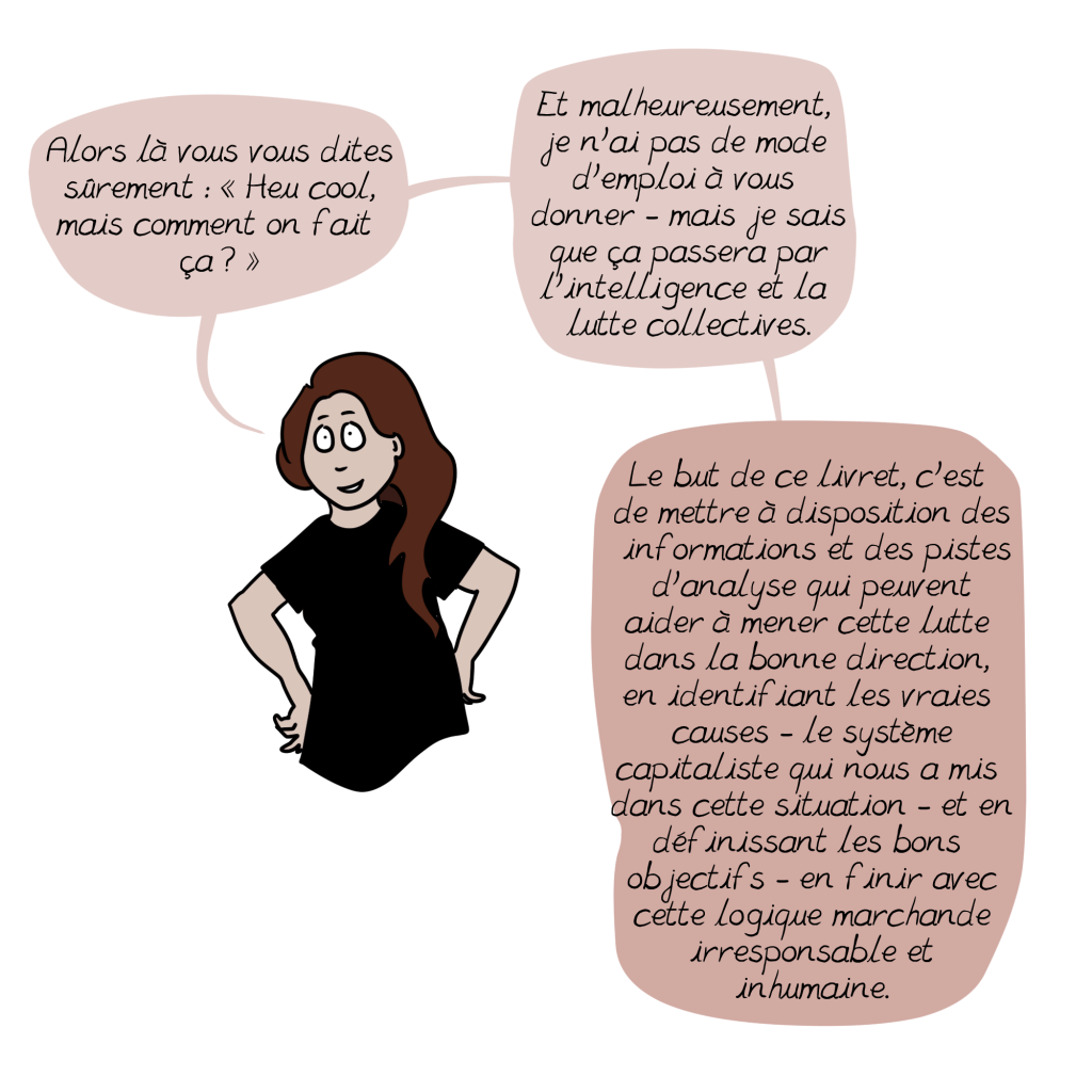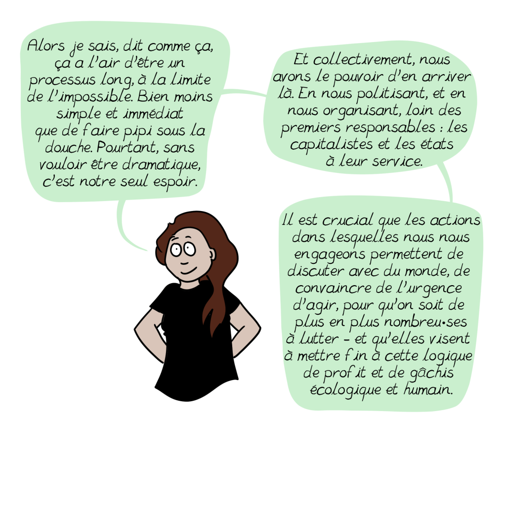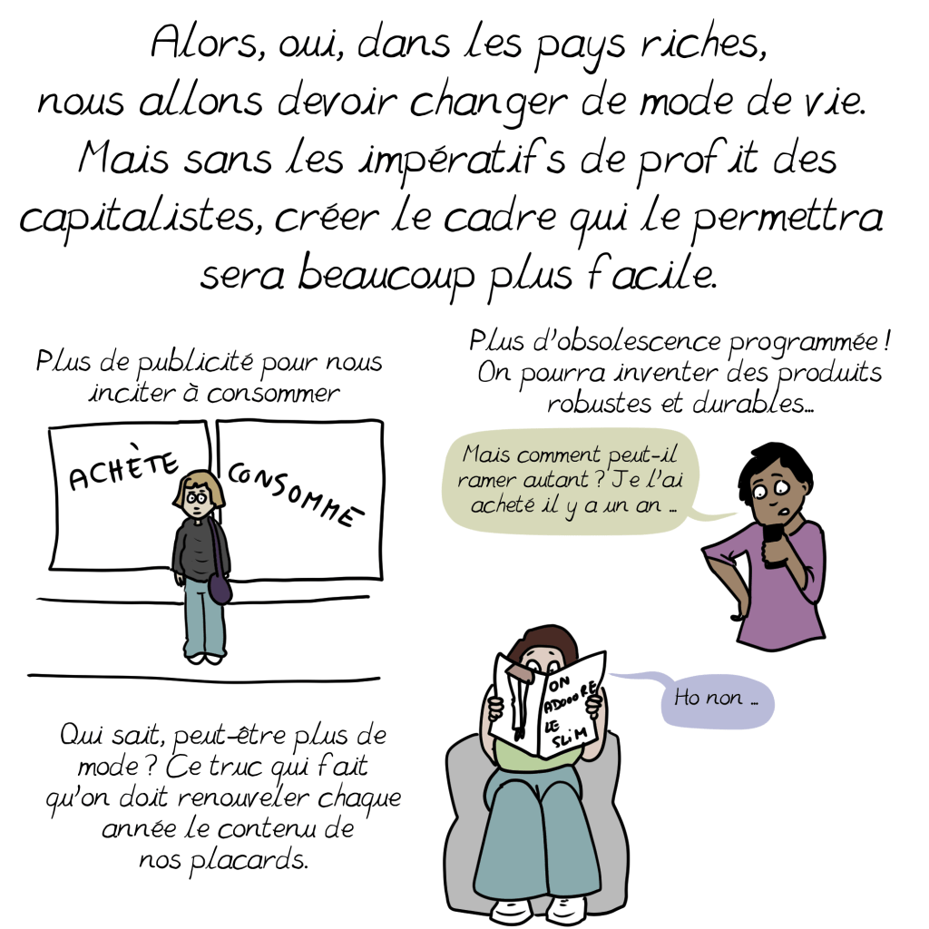 Bien sûr qu’il y a là des profits colossaux en jeu, mais ces profits ne peuvent se réaliser que grâce à notre comportement de consommateur: aucune entreprise ne peut gagner de l’argent sans ses clients. Et quand bien même, un jour (dans combien de temps?), une révolution de nature politique mettrait fin à ce système économique capitaliste fondé sur l’avidité et l’injustice, prendre soin du climat, de la planète et de ses habitants les plus pauvres, supposerait de toutes les façons alors un changement radical dans nos façons de consommer, c’est-à-dire nos façons de nous nourrir, de nous transporter, de nous chauffer, de nous habiller, afin de préserver les ressources de la planète et les répartir de façon plus équitable, n’est-ce pas?