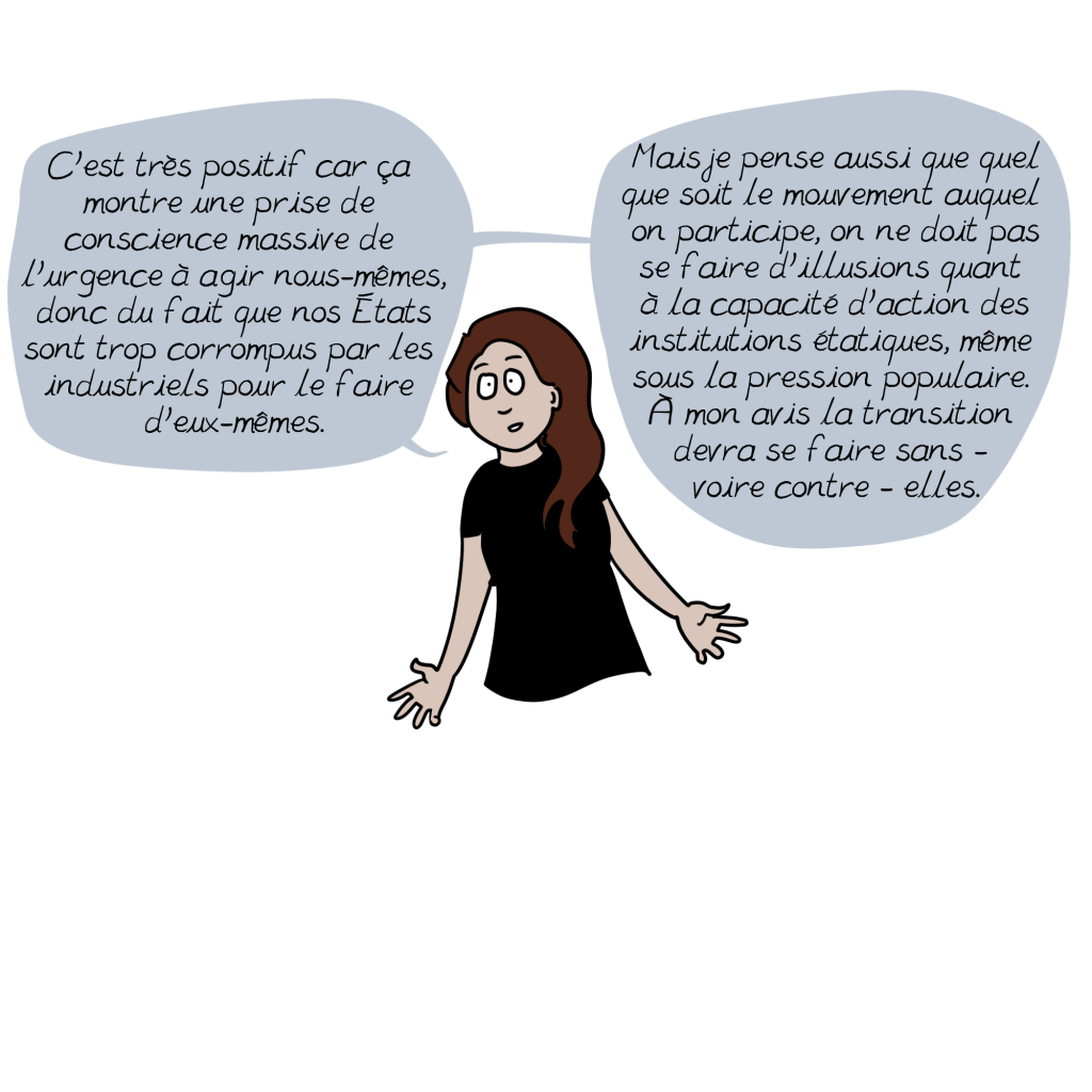 Si par exemple nous cessons tous d’acheter sur Amazon ou ailleurs des objets inutiles à obsolescence programmée produits à base d’hydrocarbures à l’autre bout de la planète par des « esclaves » modernes (et ce n’est qu’un exemple, vous pouvez en trouver des milliers d’autres), toutes ces industries extrêmement polluantes, ces entreprises au lobbying empreint du cynisme que vous dénoncez à juste titre je crois, s’effondreraient d’elles-mêmes. Même chose pour les transports, l’industrie de la viande, la mal-bouffe industrielle emballée sous plastique…