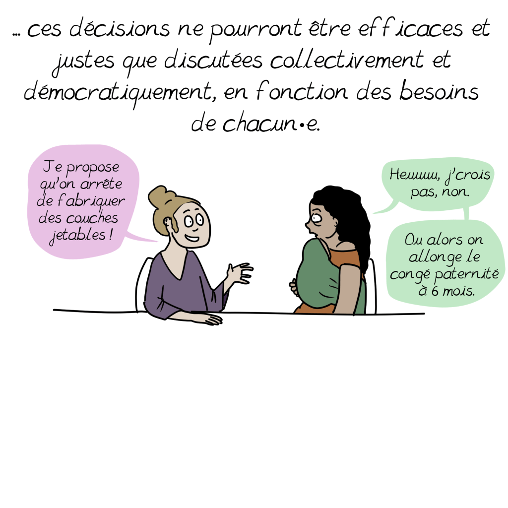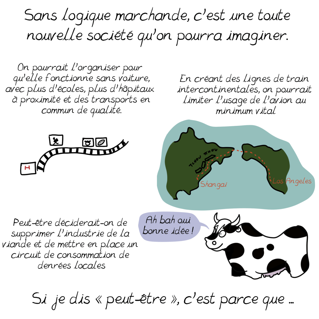 Personnellement, j’aurais une nette préférence pour un monde plus libre où chacun ferait sa propre révolution et où nous nous soutenions les uns les autres pour consommer différemment, en choisissant nous-mêmes ce que nous considérons comme essentiel et inessentiel dans notre mode de vie, en fonction de nos moyens, des ressources locales et de ce que nous aimons vivre.
