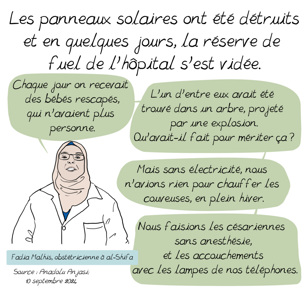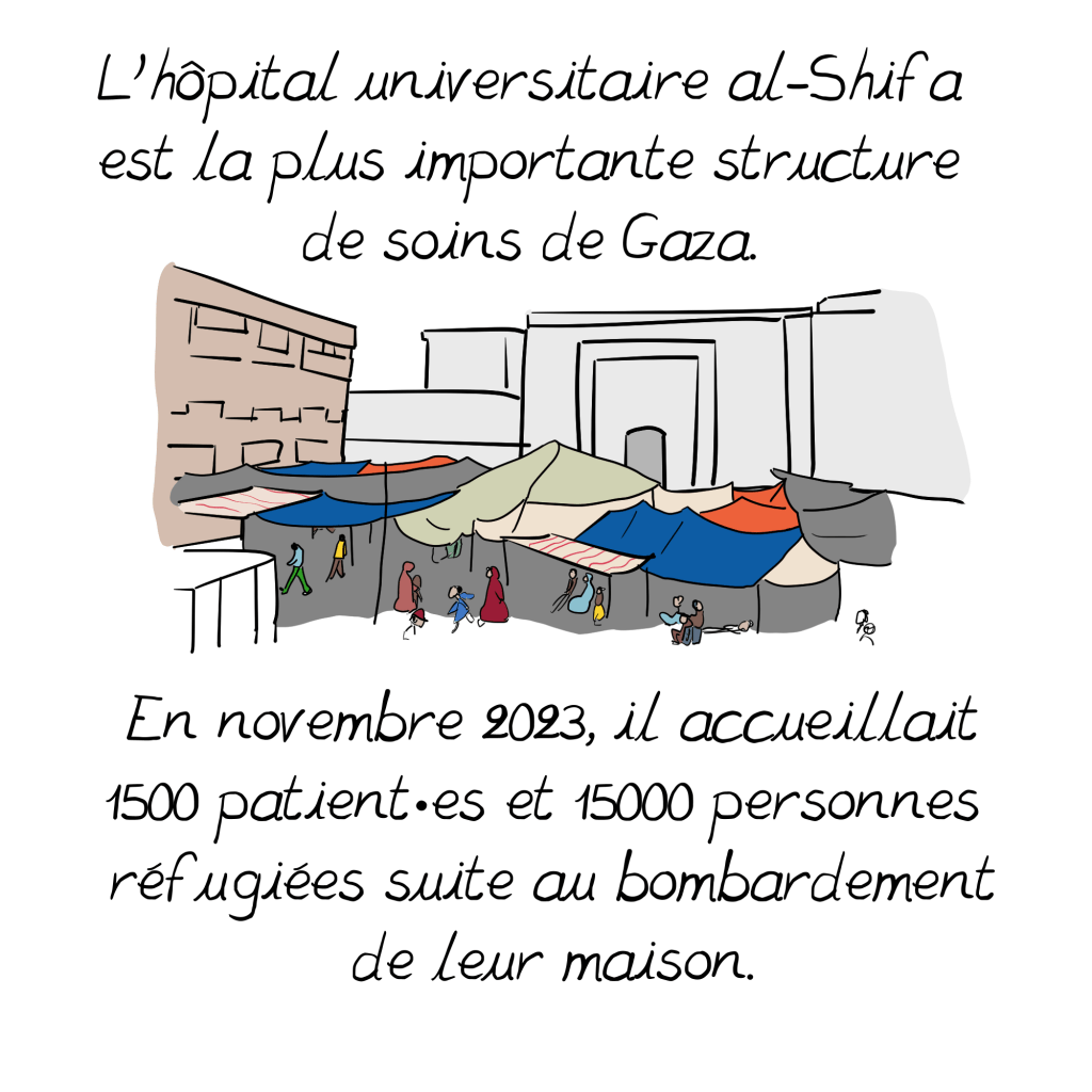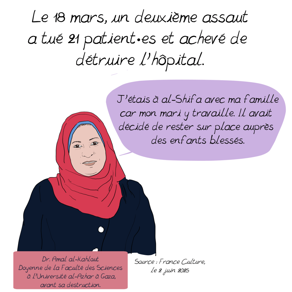 al-Shifa, un hôpital à Gaza 28 juin 202529 juin 2025 ~ Emma https://en.wikipedia.org/wiki/Al-Shifa_Hospital_siege https://www.aa.com.tr/en/middle-east/-we-gave-birth-with-phone-lights-doctor-documents-experience-at-al-shifa-hospital-in-gaza/3326869 https://www.reuters.com/world/middle-east/al-shifa-doctor-says-staff-hiding-gunfire-during-israeli-raid-2023-11-15/ https://www.msf.org/gaza-patients-and-medical-staff-trapped-hospitals-under-firehttps://thehill.com/policy/international/4305416-israeli-military-fired-on-people-al-shifa-hospital-gaza-doctors-without-borders-claims/ https://www.aljazeera.com/program/featured-documentaries/2024/10/13/al-shifa-hospital-annihilation-and-resilience https://www.radiofrance.fr/franceculture/podcasts/france-culture-va-plus-loin-l-invite-e-des-matins/jean-pierre-filiu-temoigner-de-la-guerre-inhumanitaire-contre-gaza-6464843 https://news.un.org/en/story/2024/04/1148876 https://www.idf.il/en/mini-sites/israel-at-war/briefings-by-idf-spokesperson-bg-effie-defrin/april-24-press-briefings/press-briefing-by-idf-spokesperson-rear-admiral-daniel-hagari-april-1-2024/ https://www.lemonde.fr/international/article/2025/06/27/morts-de-gaza-un-catalogue-de-1-227-pages_6616123_3210.html Télécharger la version PDF al-ShifaTélécharger Partager : Cliquer pour partager sur X(ouvre dans une nouvelle fenêtre) X Cliquez pour partager sur Facebook(ouvre dans une nouvelle fenêtre) Facebook J’aime chargement…
