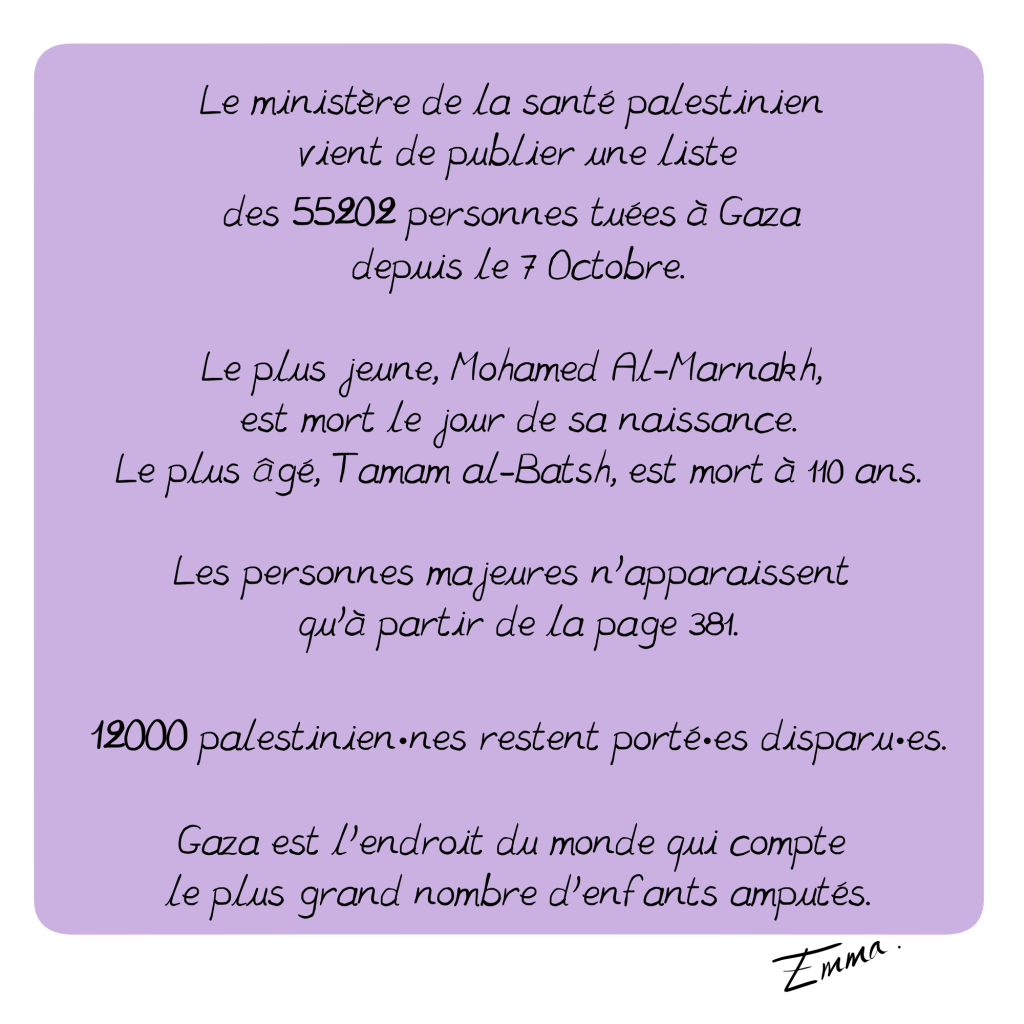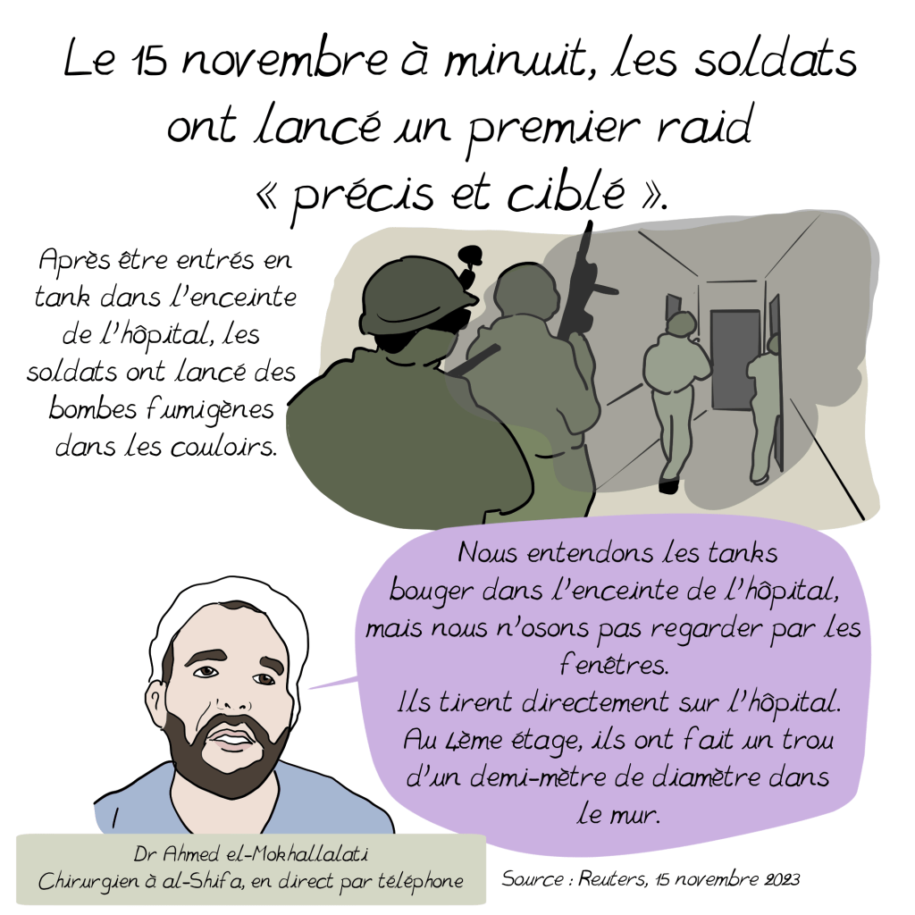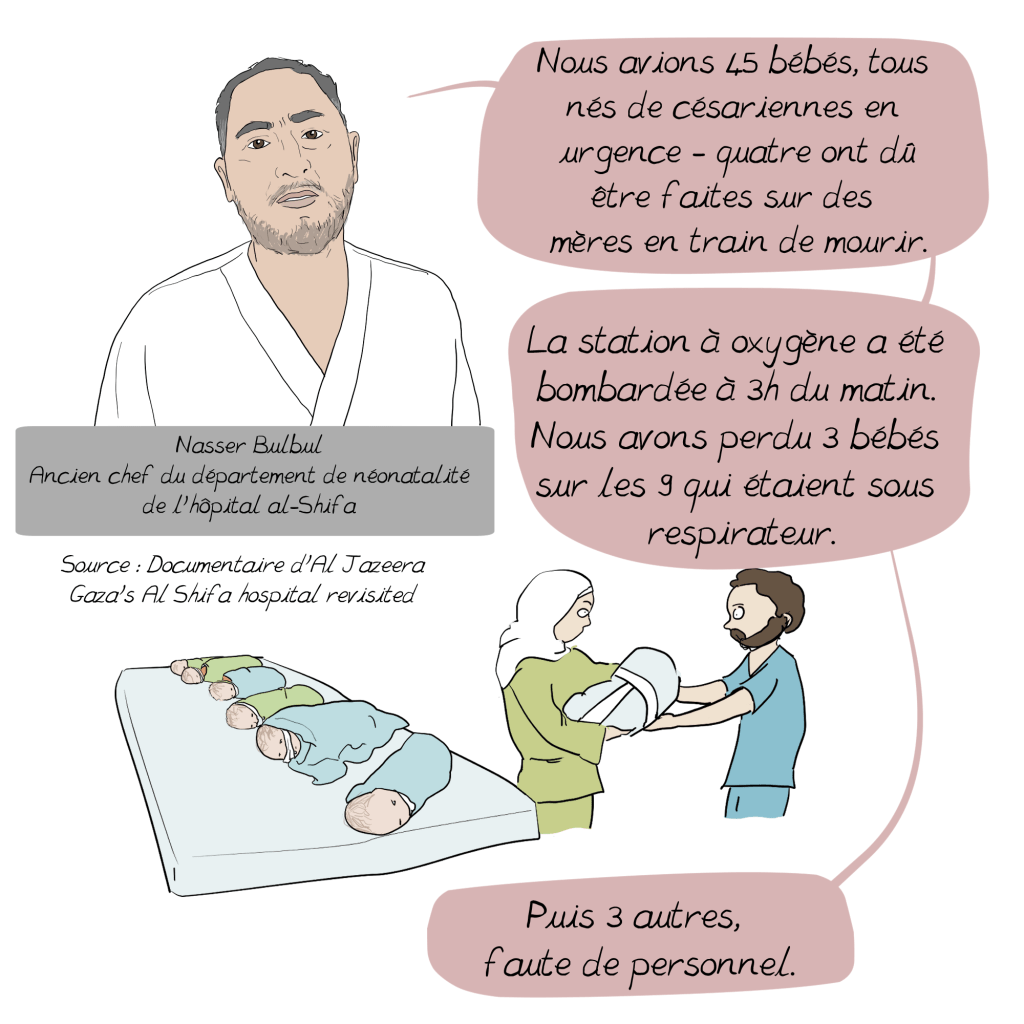 al-Shifa, un hôpital à Gaza 28 juin 202529 juin 2025 ~ Emma https://en.wikipedia.org/wiki/Al-Shifa_Hospital_siege https://www.aa.com.tr/en/middle-east/-we-gave-birth-with-phone-lights-doctor-documents-experience-at-al-shifa-hospital-in-gaza/3326869 https://www.reuters.com/world/middle-east/al-shifa-doctor-says-staff-hiding-gunfire-during-israeli-raid-2023-11-15/ https://www.msf.org/gaza-patients-and-medical-staff-trapped-hospitals-under-firehttps://thehill.com/policy/international/4305416-israeli-military-fired-on-people-al-shifa-hospital-gaza-doctors-without-borders-claims/ https://www.aljazeera.com/program/featured-documentaries/2024/10/13/al-shifa-hospital-annihilation-and-resilience https://www.radiofrance.fr/franceculture/podcasts/france-culture-va-plus-loin-l-invite-e-des-matins/jean-pierre-filiu-temoigner-de-la-guerre-inhumanitaire-contre-gaza-6464843 https://news.un.org/en/story/2024/04/1148876 https://www.idf.il/en/mini-sites/israel-at-war/briefings-by-idf-spokesperson-bg-effie-defrin/april-24-press-briefings/press-briefing-by-idf-spokesperson-rear-admiral-daniel-hagari-april-1-2024/ https://www.lemonde.fr/international/article/2025/06/27/morts-de-gaza-un-catalogue-de-1-227-pages_6616123_3210.html Télécharger la version PDF al-ShifaTélécharger Partager : Cliquer pour partager sur X(ouvre dans une nouvelle fenêtre) X Cliquez pour partager sur Facebook(ouvre dans une nouvelle fenêtre) Facebook J’aime chargement…